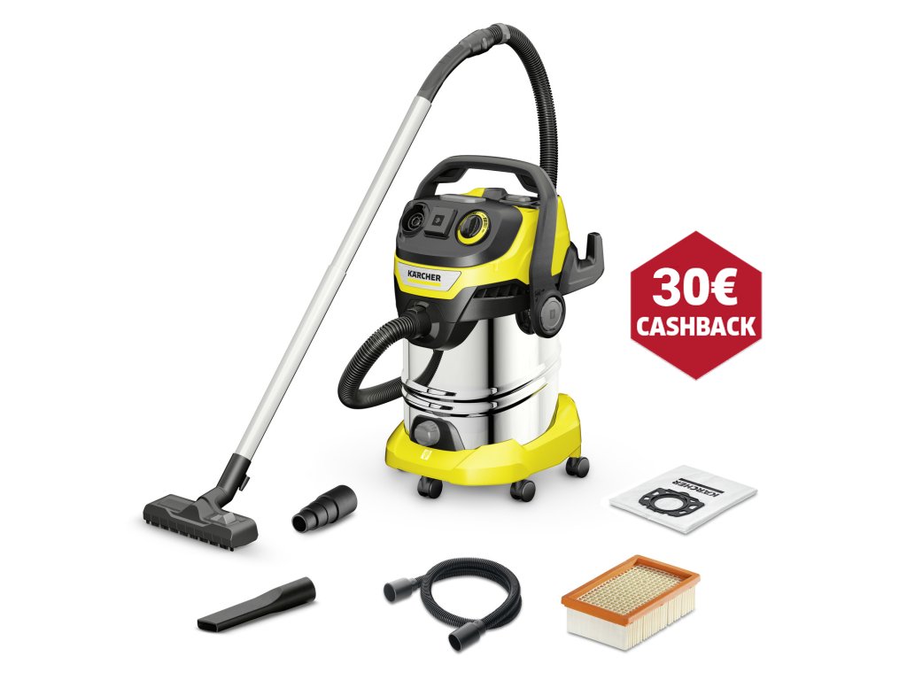 Mimoriadne výkonné sanie a vynikajúca energetická účinnosť so spotrebou iba 1300 wattov: Vysávač na mokré a suché vysávanie WD 6 P S V-30/6/22/T má 30-litrovú nádobu z nehrdzavejúcej ocele, 6-metrový -dlhá šnúra a 2,2 metra dlhá sacia hadica. Vypúšťaciu skrutku možno použiť na pohodlné vypustenie kvapalín, ktoré boli povysávané. Elektrické náradie, ako sú píly alebo brúsky, je možné pripojiť pomocou integrovanej zásuvky s automatickým vypínačom. Vzniknuté nečistoty sa ihneď odstránia odsávaním. Otočný spínač umožňuje užívateľovi nastaviť sací výkon tak, aby vyhovoval jeho potrebám. Plochý skladaný filter možno vybrať otvorením filtračného boxu bez toho, aby sa dostal do kontaktu s akoukoľvek nečistotou. A čo viac, filter možno efektívne vyčistiť stlačením tlačidla čistenia filtra, čím sa obnoví plný sací výkon. Funkcia ofukovania je užitočná najmä pri čistení zložitých predmetov. Odnímateľná rukoväť s elektrostatickou ochranou umožňuje pripojenie príslušenstva priamo k sacej hadici, čo je výhodné najmä pri vysávaní jemného prachu. Medzi ďalšie výhody patrí kompaktné uloženie sacej hadice zavesením na hlavu prístroja a parkovacia poloha pre podlahovú hubicu.